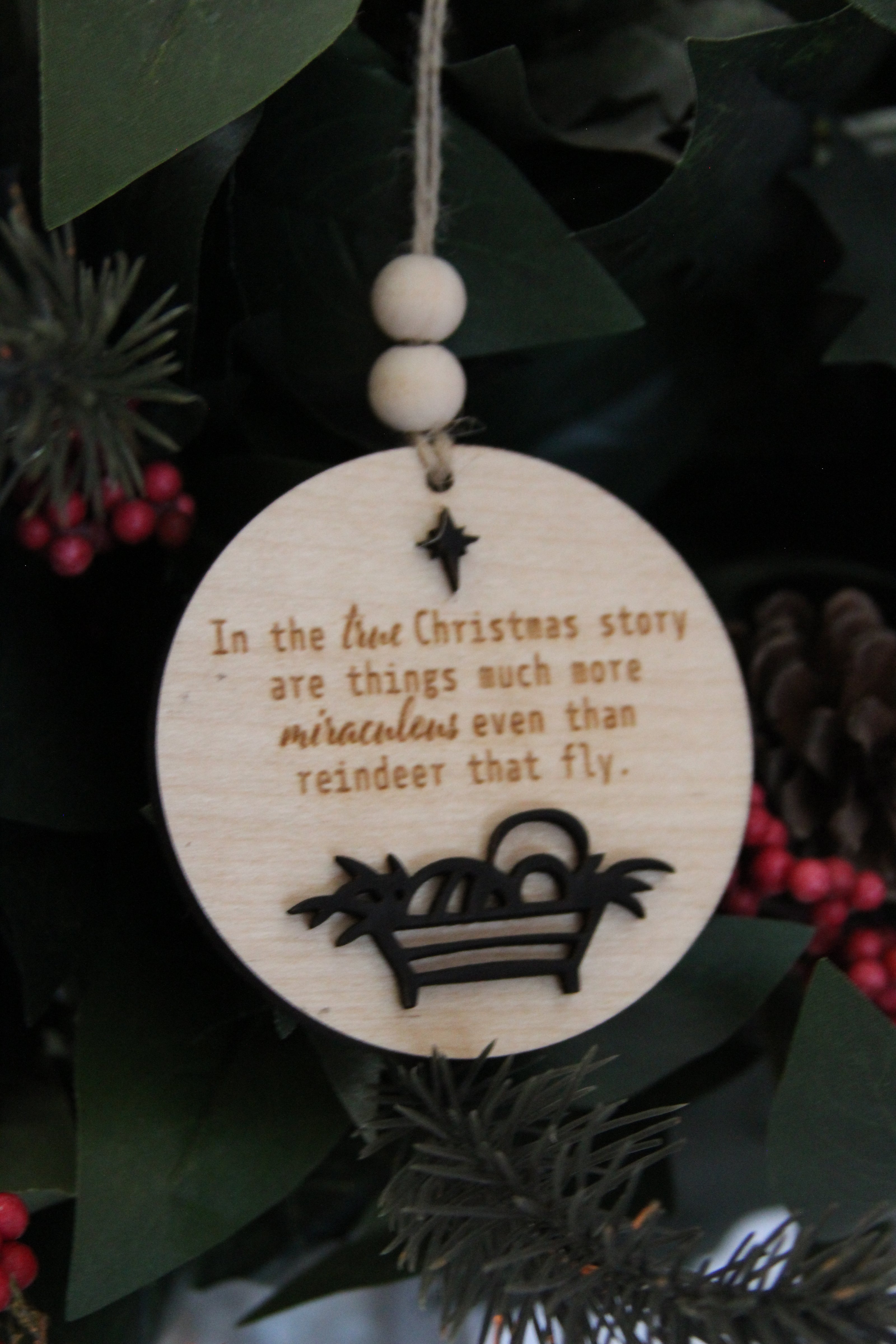 “In the true Christmas story are things much more miraculous eve than reindeer that fly.” is engraved while the manger is 3D. This ornament measure approximately 3”