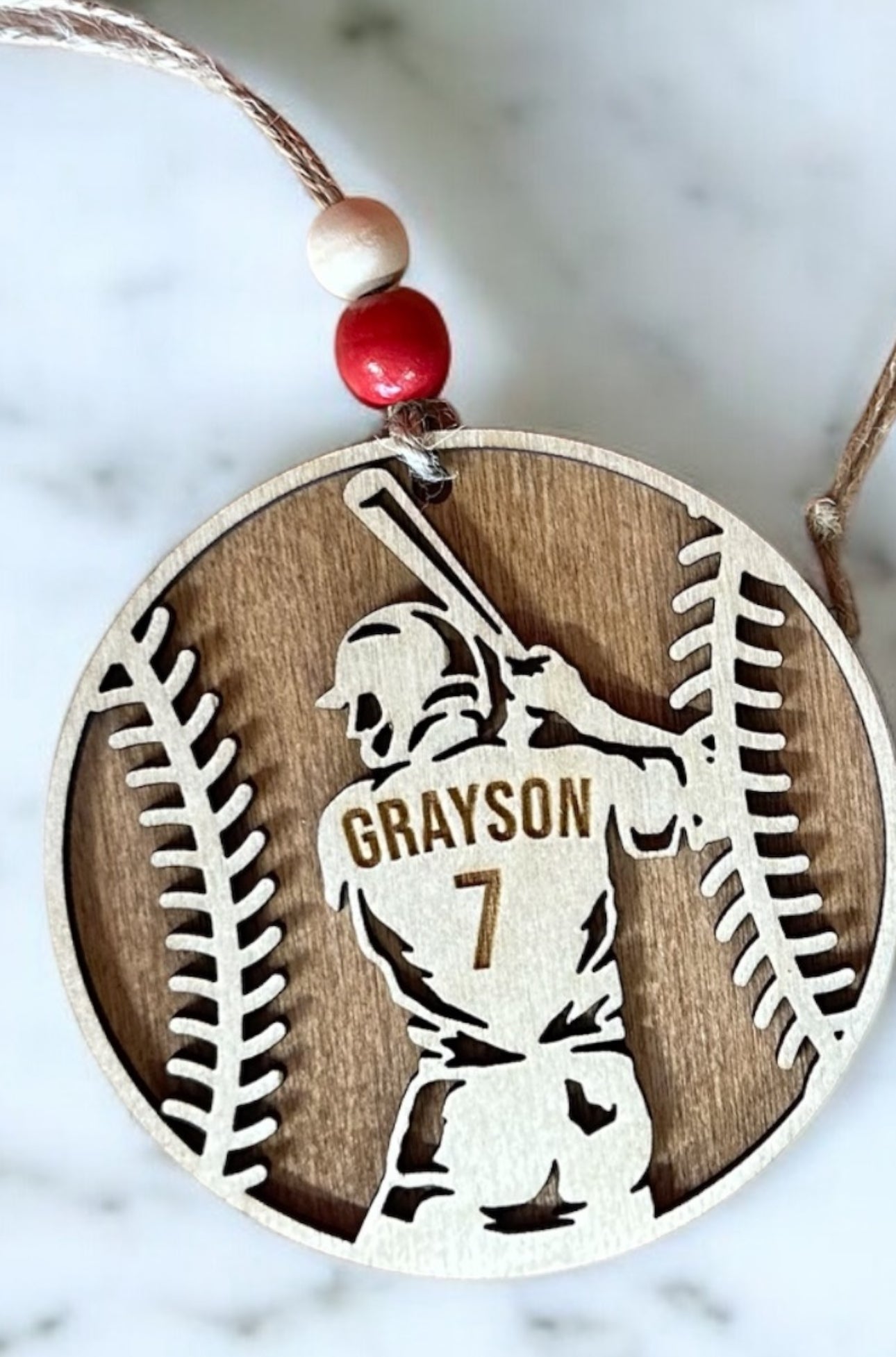 Celebrate the spirit of baseball with this beautifully crafted wooden ornament, designed to commemorate the end of a fantastic Little League season or add a personal touch to your holiday decorations. Expertly laser-cut from high-quality wood, this ornament features a classic baseball shape, with a detailed player in the center, capturing the dynamic energy of the game. Whether you're hanging it on the Christmas tree or giving it as a thoughtful end-of-season gift, this ornament serves as a perfect reminder of the hard work, teamwork, and fun that define the season. Its timeless design and natural wood finish make it a keepsake that will be treasured for years to come. Add this charming ornament to your collection and bring a touch of baseball nostalgia into your home this holiday season or after the final game of the year.