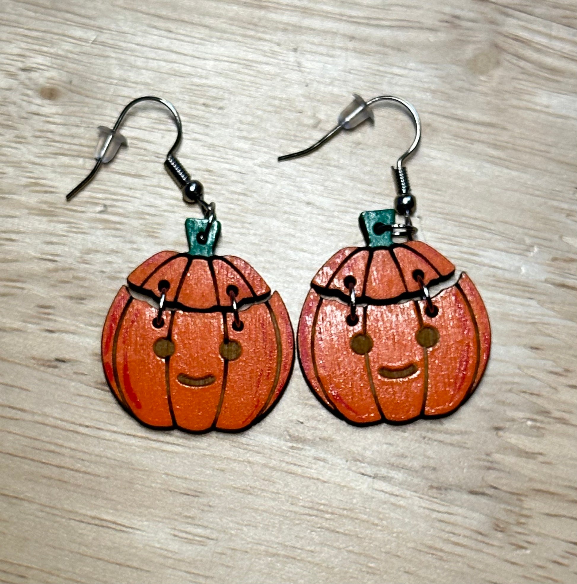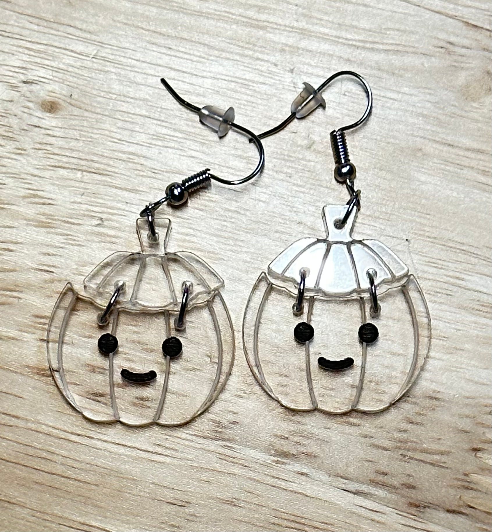 Cute pumpkin smily earrings, hand painted or clear acrylic, stainless steal hardware and removable rubber stopper.