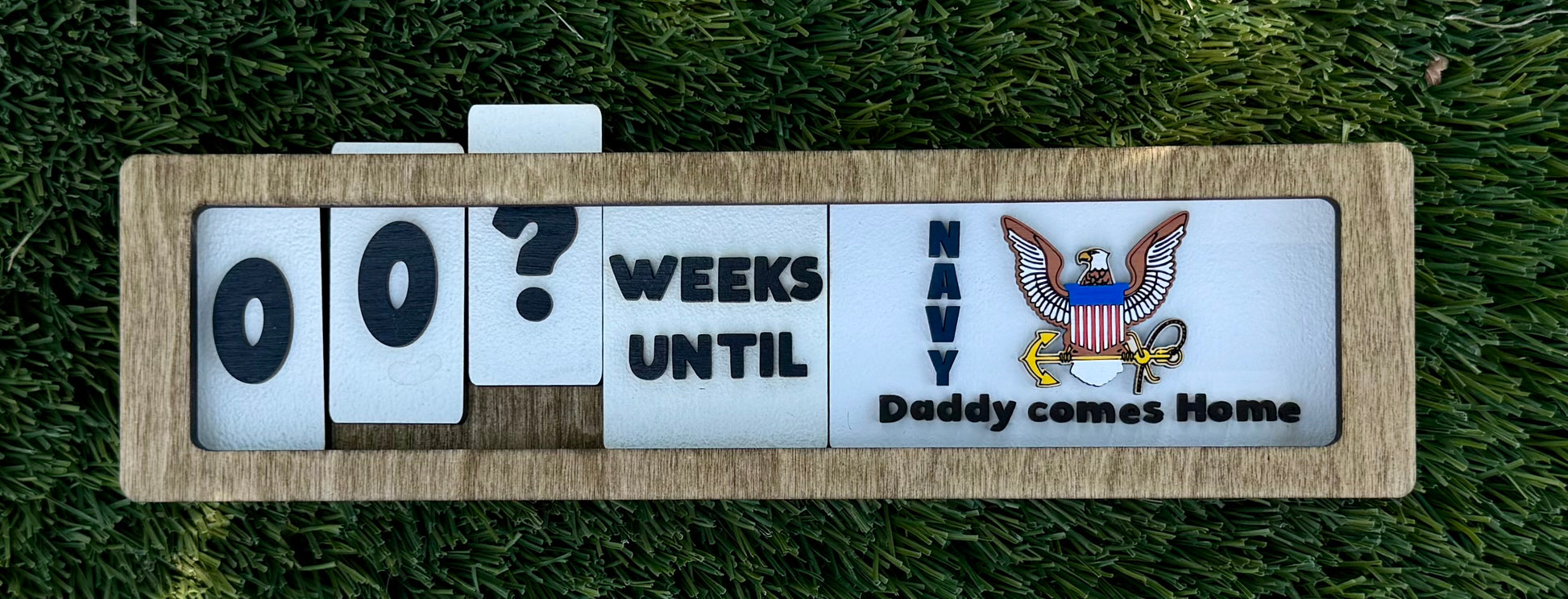 Count down the weeks/months until the sweetest reunion with this beautifully handcrafted and hand-painted wooden Navy countdown sign. Made with love and precision, this durable piece features interchangeable number tiles so you can update the countdown each week.