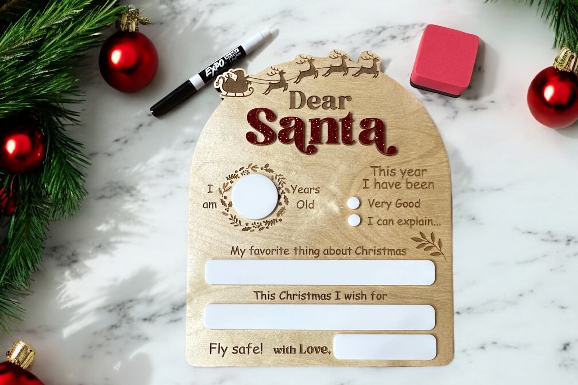 Introducing our charming "Dear Santa" Wooden Sign with Dry Erase Acrylic – the perfect holiday keepsake for families! This beautifully crafted sign features a rustic wooden frame that adds a touch of warmth to your festive decor. The dry erase acrylic surface allows for easy writing and erasing, making it a reusable treasure for years to come.
