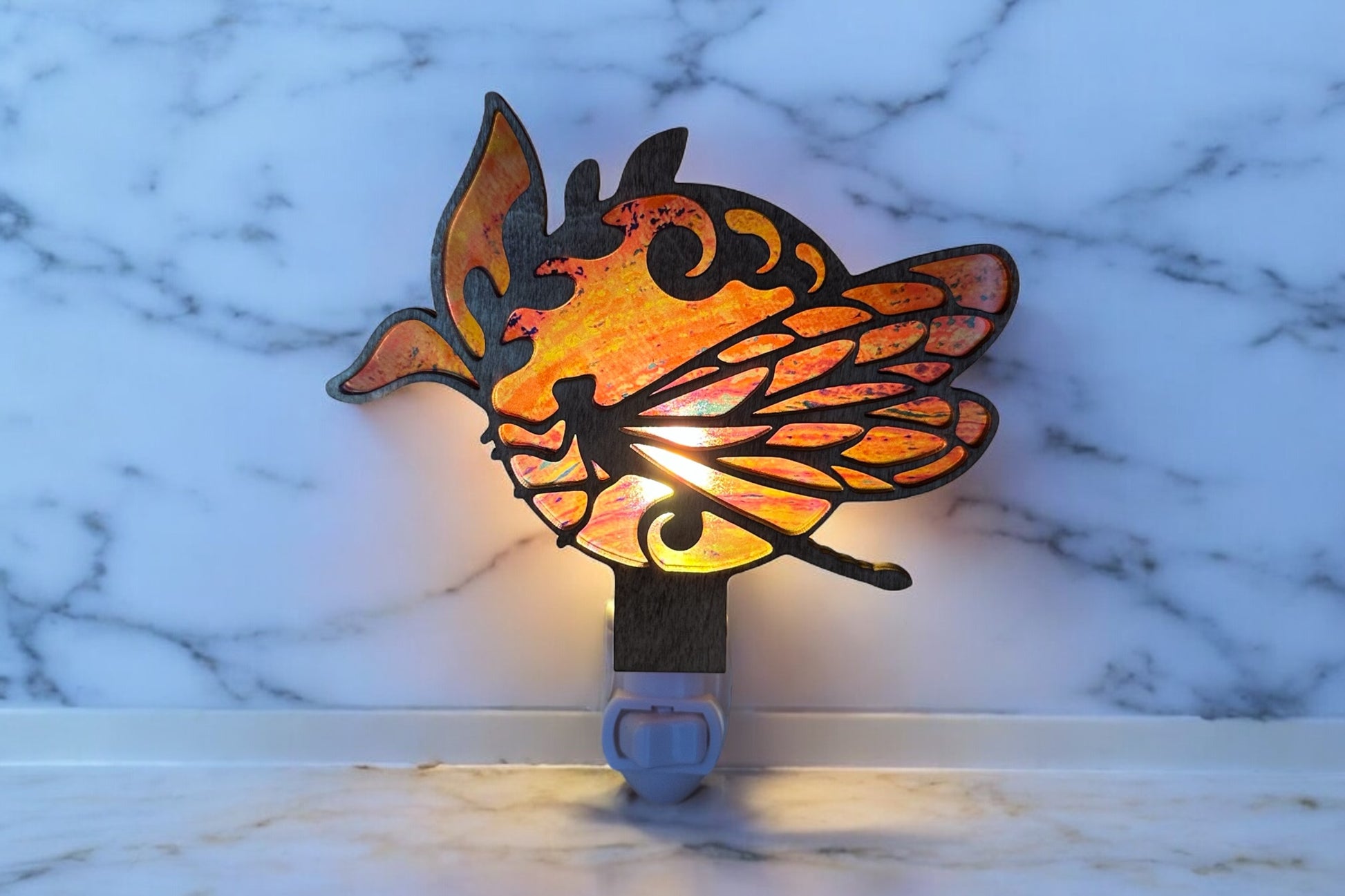 Bring a touch of nature and warmth to any space with this stunning dragonfly wooden nightlight. Handcrafted with precision, this unique nightlight features a delicate hummingbird design, beautifully illuminated by a soft pink acrylic that glows with a gentle LED light.