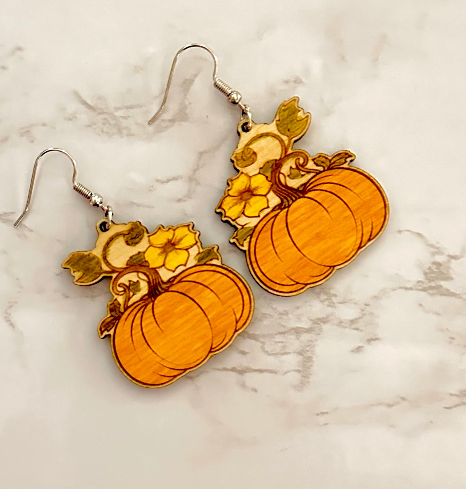 Wooden Fall Pumpkin wooden earrings, hand painted. With stainless steal hardware and removable rubber stopper.