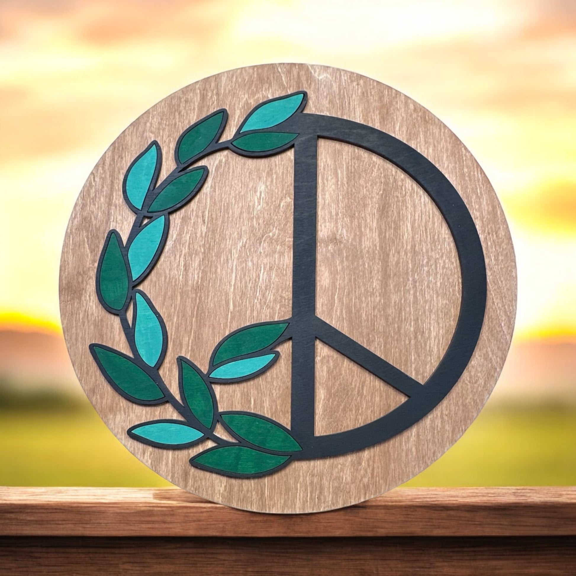 Peace sign and leaves is a charming and nature-inspired decor piece. Crafted from high-quality wood, this sign showcases a peace symbol adorned with intricately designed leaves, creating a harmonious and tranquil aesthetic. The natural wood finish adds warmth and character to any space, making it a perfect addition to a home or office setting. This unique and eco-friendly sign serves as a symbol of peace and nature, bringing a touch of serenity and beauty to your surroundings.