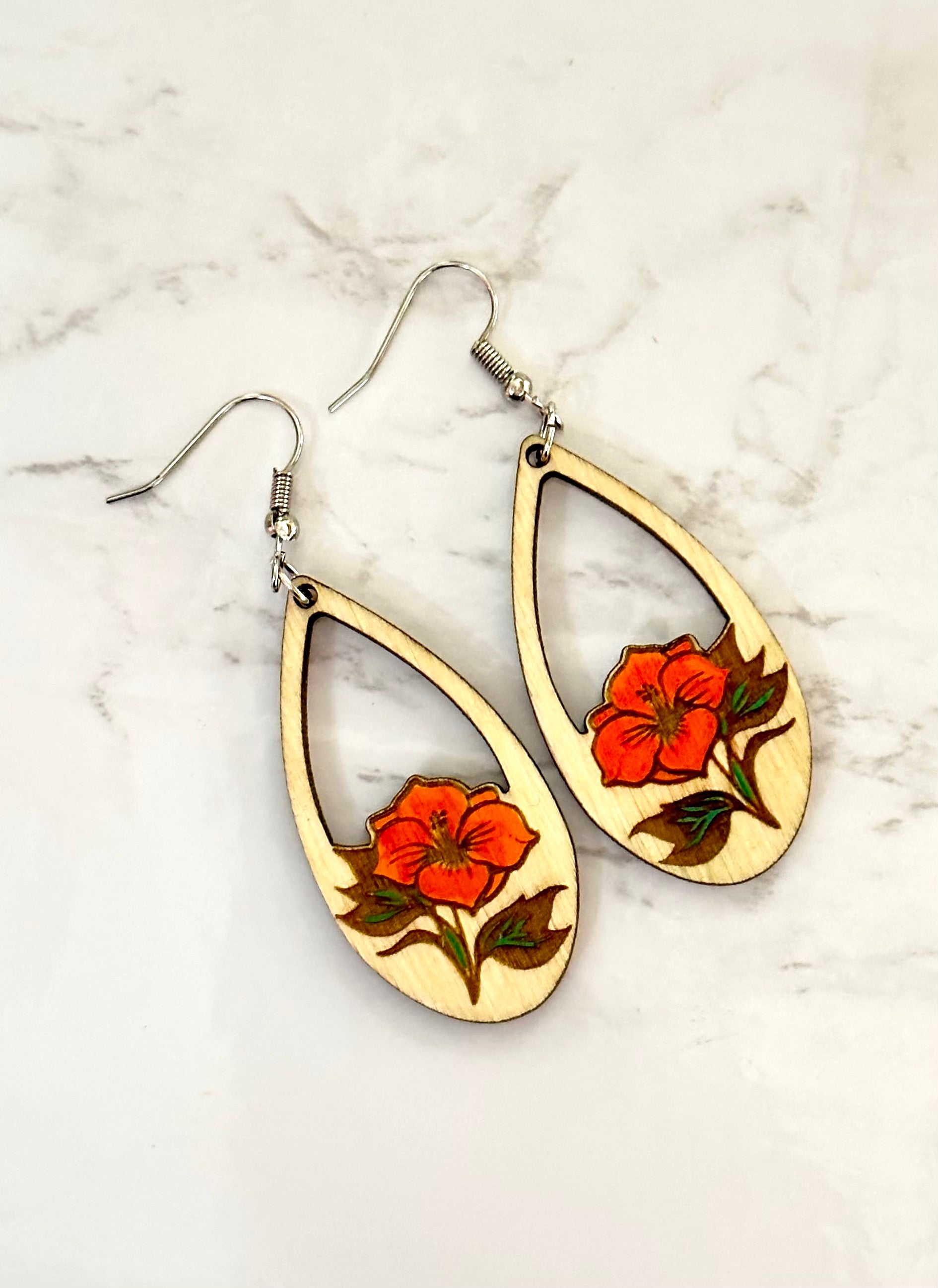 Hibiscus Flower Earrings with an orange-ish red hand painting. With stainless steal hardware and removable rubber stopper.