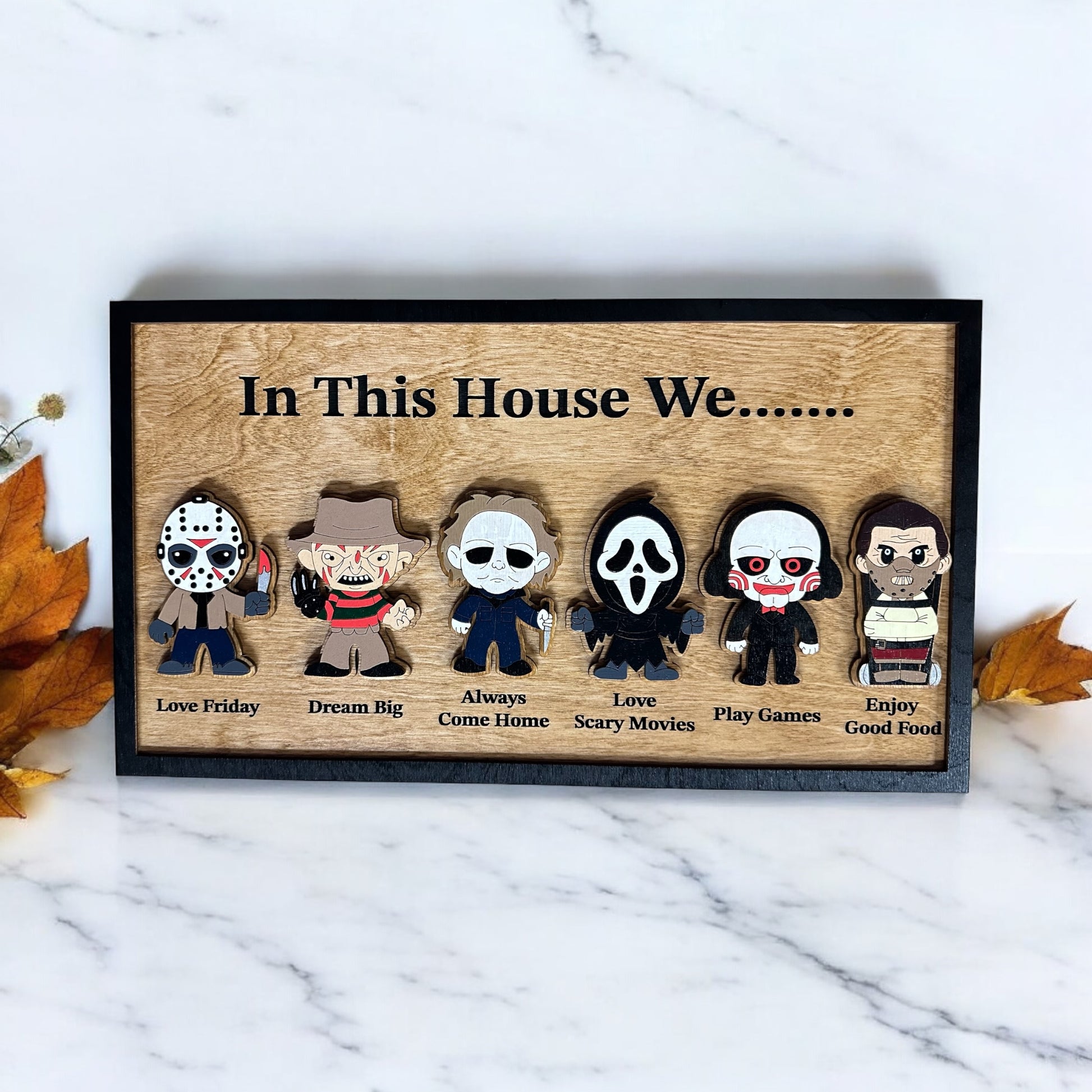Introducing the perfect addition to your Halloween-themed decor: the "In this house we..." sign featuring a collection of iconic horror characters. Each character is paired with a unique phrase to capture the essence of your household's interests and passions. From "love Friday" to "dream big," "love scary movies," "play games," and "enjoy good food," this sign embodies a blend of spooky fun and everyday delights. Whether you're a horror enthusiast or simply enjoy a good scare, this sign is sure to add a touch of eerie charm to your home. Embrace the spirit of Halloween with this captivating and versatile piece that celebrates both the thrill of the unknown and the comforts of home.