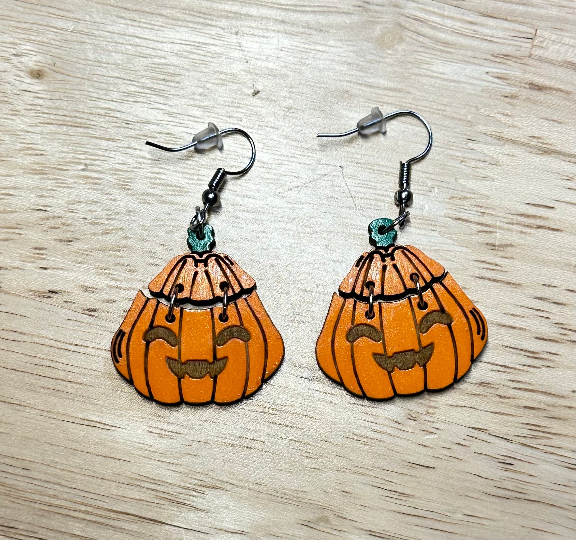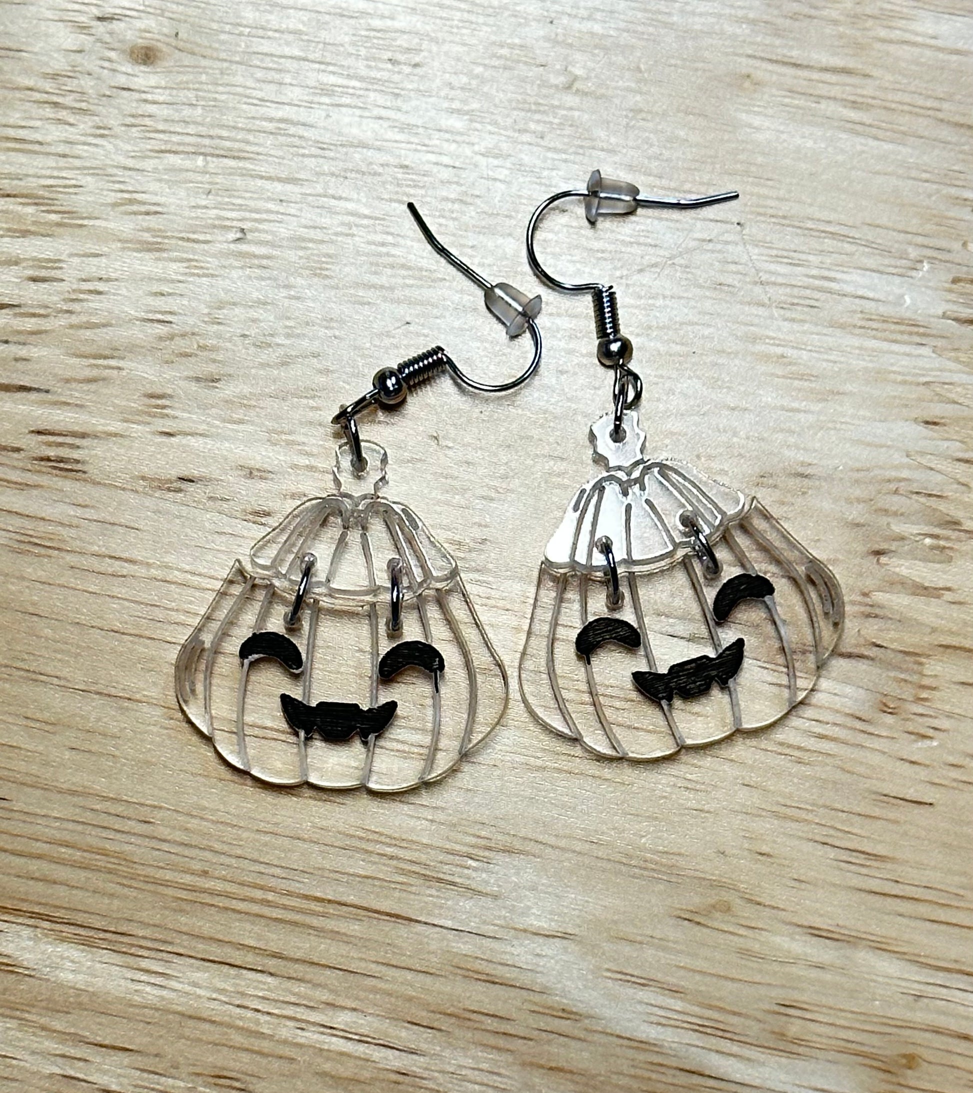 Pumpkin Earrings, comes in either handprinted wood, or clear acrylic.stainless steal hardware and removable rubber stopper.