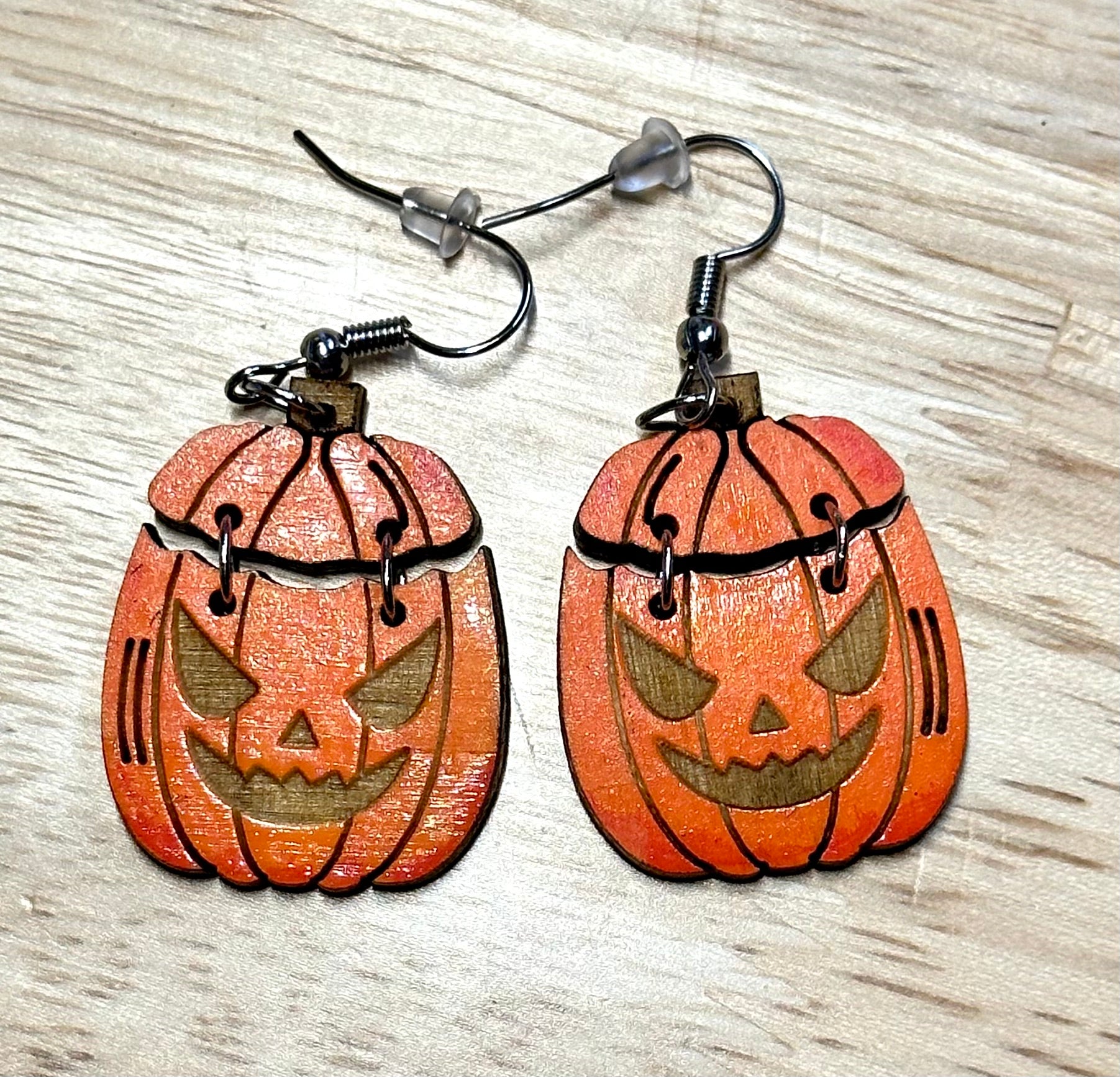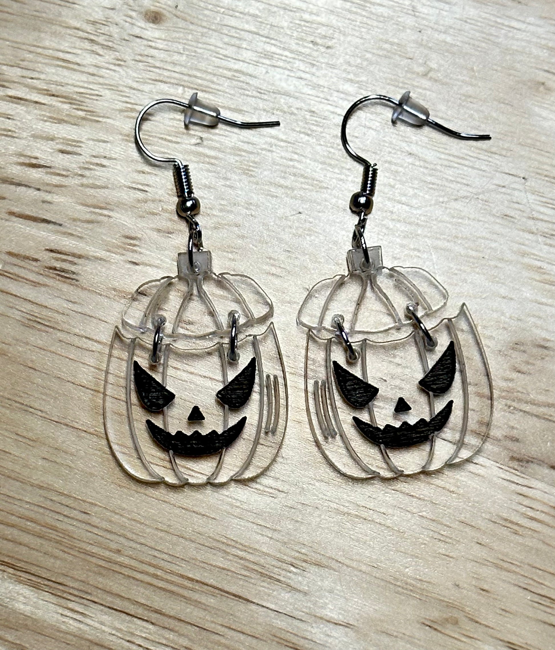 Scary face pumpkin earrings either hand painted or clear acrylic stainless steal hardware and removable rubber stopper.