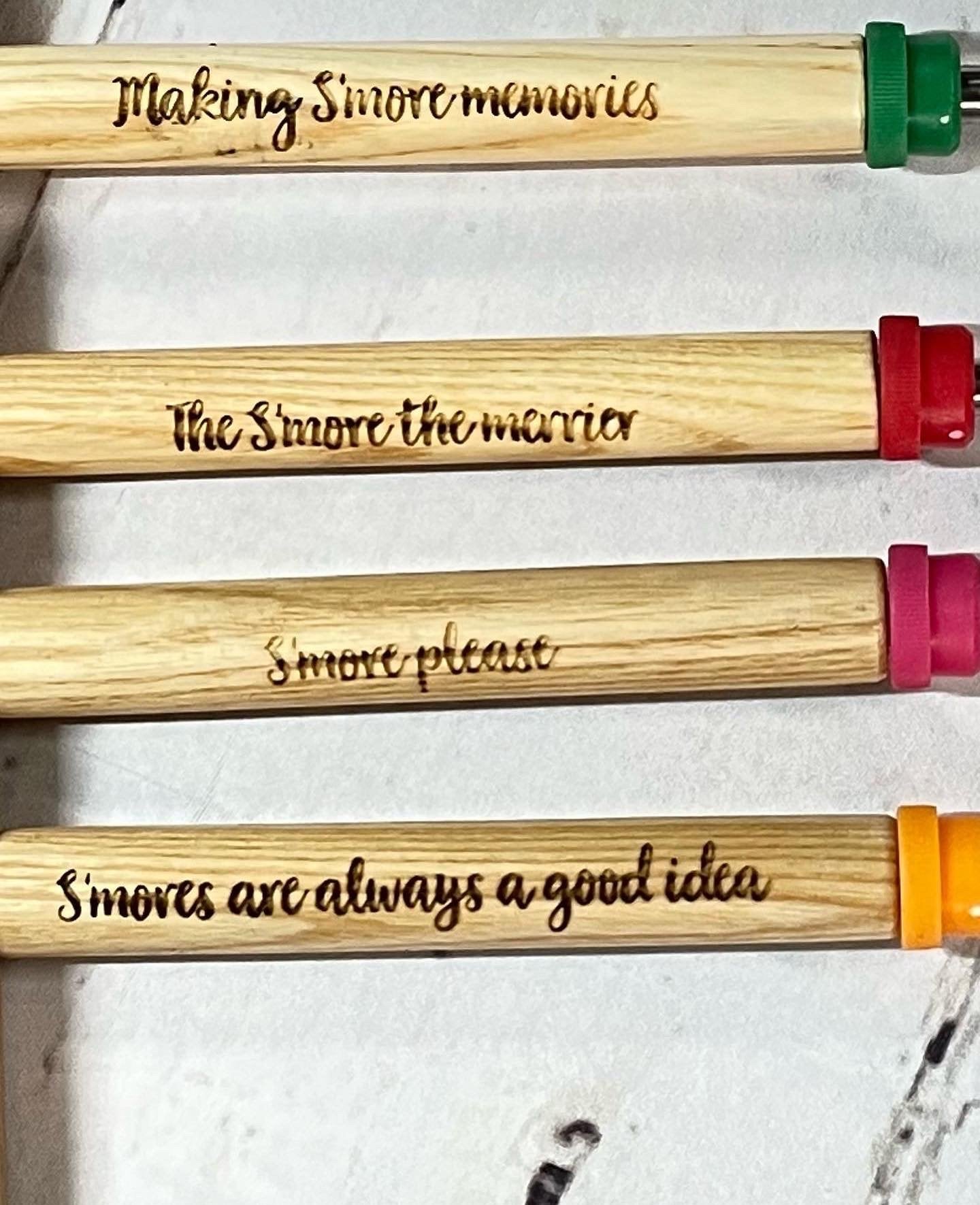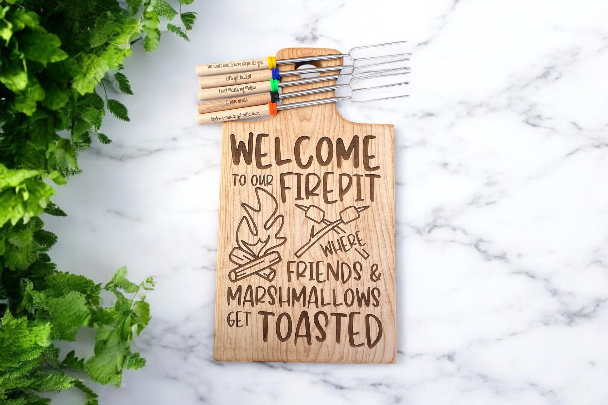 This handcrafted charcuterie board is made from premium maple hardwood, ensuring durability and a beautiful natural grain pattern. Perfect for any occasion, it features a charming engraving that reads, "Let’s Get Toasted," adding a playful touch to your gatherings. Ideal for taking all your s’more ingredients out to the fire pit, this board also comes with five marshmallow roasting sticks, they can hold up to 2lbs, making it perfect for enjoying cozy fireside moments. Whether you're hosting a party or enjoying a quiet evening, this unique piece brings warmth and fun to any setting.
