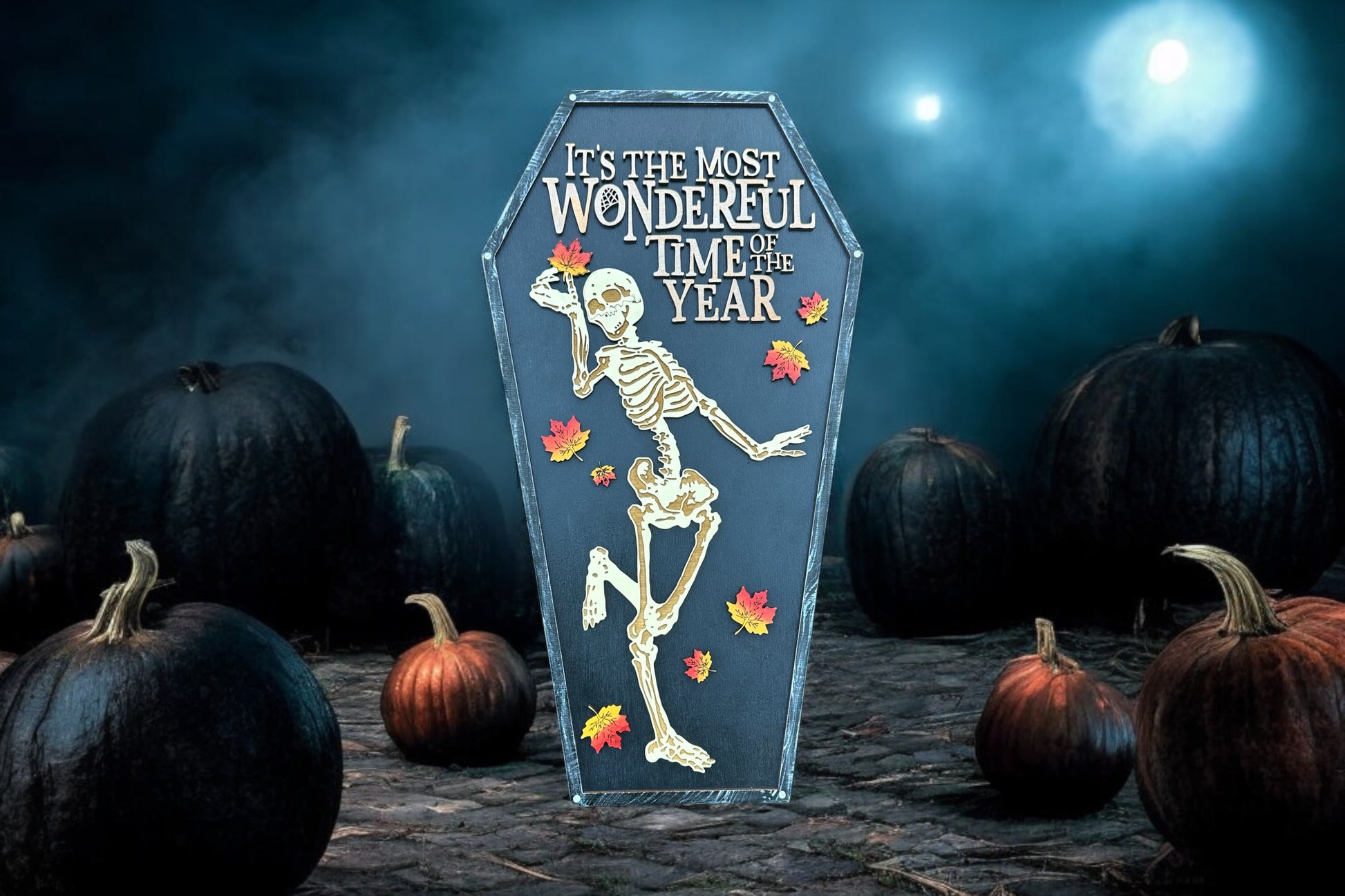 Add a spooky touch of charm to your Halloween decor with this handcrafted wooden coffin sign! Shaped like a classic coffin and featuring a joyful dancing skeleton, it playfully reads "It's the Most Wonderful Time of the Year." Each piece is hand painted with care, making it a fun and festive addition to your home, porch, or party display. Whether you’re a Halloween enthusiast or just love a bit of seasonal humor, this sign is the perfect blend of creepy and cheerful!