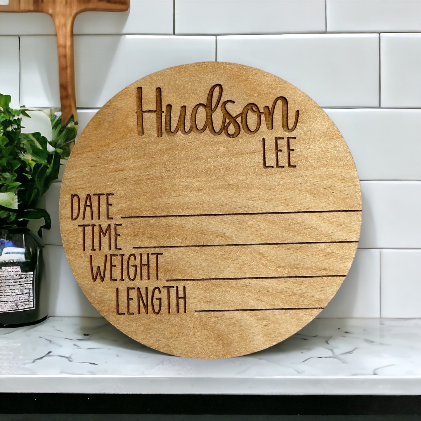 Handcrafted wooden baby announcement sign featuring a charming and timeless design. This custom-made piece is the perfect way to celebrate the arrival of a new baby and share the joyous news with friends and family. The sign is two sided, personalized with the baby's name on front and birth date, weight, length, and other special details on back to create a unique keepsake that will be treasured for years to come. Made from high-quality wood, this announcement sign is durable and can be displayed in the nursery, or at a baby shower.